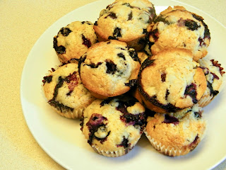 Preheat oven to 375 degrees. Grease and flour tins. Mix dry ingredients. Cut in butter, add egss and beat. Add other moise ingredients. Stir until moistened. Roll blueberries in flour (I rarely do this, but they do ten to fall to the bottom if you don't). Fold in blueberries. Put in muffin tins and sprinkle with sugar.